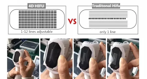 4D is the meaning of the three dimensions, this 4D refers to the development of technology in three dimensions of innovation. The number of rows is multi-dimensional, the traditional HIFU shot once only can get 1 line, so it will be a little toublesome to do body weight loss. But 4D HIFU can be freely adjusted from 1-12 lines.